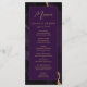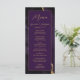 Este elegante e moderno menu de casamento mostra uma cor d'água roxa de fundo arredondada com brilho dourado. O texto aparece em letras elegantes douradas e fontes sans serif em um retângulo de ameixa. O design de ágata é repetido no reverso.