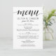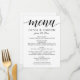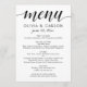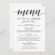 Cartões de cardápio preto e branco modernos e chic apresentam um design tipográfico na moda preto com acentos de script de caligrafia e texto elegante personalizado que pode ser personalizado com seus deliciosos detalhes de menu de janto e um monograma dos nomes de noiva e noiva e data de casamento.