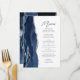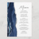 Este elegante cardápio moderno de casamento apresenta uma cor azul-d-água marinho, borda agitada com falso brilho prateado. O texto personalizável combina o script de escrita manual de cinzas de carvão e as fontes sans serif em um fundo branco. O design de agata azul e prateado do marinho é repetido no verso.
