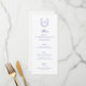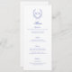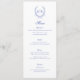 Este elegante menu de casamento apresenta um fundo branco com um monograma rodeado por uma crista/moldura botânica com uma fita em azul. Personalize-o para as suas necessidades. Você pode encontrar produtos correspondentes na minha loja.