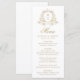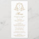 Traga um pouco de elegância eterno para sua recepção com este cardápio de ouro. Apresentando o monograma do casal enquadrado por uma crista botânica de ouro sobre fundo branco, esta design expele sofisticação. O "Menu" é escrito em refinada caligrafia dourada no topo, com espaço abaixo para mostrar os nomes do casal, a data do casamento e as seleções personalizadas de menu. Ideal para temas de casamento românticos, formais ou clássicos, este menu adiciona um detalhe de acabamento luxuoso à sua capa de mesa.