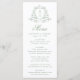 Adicione um toque elegante às suas mesas de casamento com este cardápio de casamento verde sábio. O monograma do casal é enquadrado por uma crista botânica verde-sábio, criando um ponto focal sereno contra o fundo branco. O "Menu" aparece na caligrafia verde-saudável, com texto personalizado abaixo para nomes, data de casamento e detalhes de janto. Uma bela escolha para jardim, ao ar livre ou casamentos inspirados na natureza.