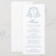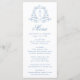 Elevem sua recepção com o charme calmo deste cardápio de casamento azul. Uma delicada crista botânica azul rodeia o monograma do casal no topo, tudo colocado sobre um fundo branco. O "Menu" é exibido na elegante caligrafia azul, com espaço para personalizar os nomes do casal, a data do casamento e as ofertas de menu personalizadas. Perfeito para temas de casamento românticos, costeiros ou elegantes, esta design traz uma sensação serena e refinada para a sua celebração.