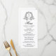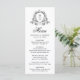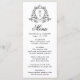 Adicione um toque de eterno às suas mesas de recepção com este elegante menu de casamento floral preto. O design apresenta o monograma do casal, enquadrado por uma sofisticada crista botânica negra sobre fundo branco. O "Menu" é exibido na caligrafia negra graciosa no topo, seguido de espaço para personalizar os nomes do casal, a data do casamento e as seleções de menu personalizadas. Perfeito para temas clássicos, formais ou negros e brancos de casamento, este menu personalizado define um tom refinado para sua celebração.