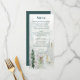 Cena de inverno com madeira de pinheiro coberta de neve e veado com galhadas. As caixas de texto são fáceis de personalizar com suas próprias informações. A parte de trás do cartão é um verde-pinho escuro que corresponde à cor das árvores.