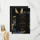 Este elegante menu de casamento, humorístico, apresenta um buquê floral romântico e luxuoso em azul marinho com folha de ouro e folhagem brilhante num fundo negro. Personalize o texto dourado em fontes na moda em um retângulo preto. A parte traseira da placa é preta e sólida.