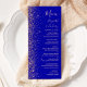 A borda esquerda deste elegante cardápio moderno de casamento apresenta um rosa dourado faux glitter design. O texto personalizável combina letras rosa pálidas, letras em copperplate e fontes itálicas em um fundo azul real. O verso apresenta um design brilhante azul real e rosa.