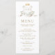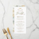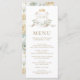 Menu de casamento elegante com uma crista vintage com monograma. Sacudir o cartão para revelar um belo padrão floral com penas de pavão.