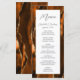 Este elegante e moderno menu de casamento mostra uma cor-de-água queimada, cor de laranja, e o fundo cortado com brilho dourado. O texto aparece na escrita elegante de cinzas de carvão vegetal e sans serif fonts em um retângulo branco. O design de ágata é repetido no reverso.