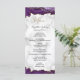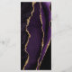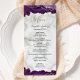 Este elegante e moderno menu de casamento apresenta bordas de cima e de baixo da cor d'água púrpura e cortada com brilho dourado. O texto aparece em um guião elegante e dourado de escrita manual e fontes itálicas e em prato preto em uma cinza e fundo de mármore branco. O design de ágata é repetido no reverso.