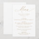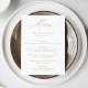 Aumente sua recepção de casamento com este luxuoso menu de casamento, mostrando "Menu" em elegante caligrafia dourada contra um fundo branco nítido. A design moderna, simples e sofisticada permite que os casais personalizem o cardápio com seus nomes, data de casamento e detalhes das refeições em negrito dourado. Ideal para casamentos formais e casuais, este menu exude elegância do eterno e complementa qualquer tema de casamento. Quer você esteja hospedando uma grande comemoração ou um caso íntimo, este cardápio espantoso vai elevar sua recepção, oferecendo um toque refinado e memorável para seu dia especial.