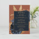 Este elegante menu de casamento apresenta um buquê floral romântico e luxuoso em azul marinho com folha de ouro e folhagem brilhante num fundo laranja robusto ou queimado. Personalize o texto dourado em fontes na moda em um retângulo azul marinho. A parte traseira da placa é sólida.