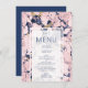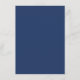 Este elegante e moderno menu de casamento apresenta um fundo azul marinho, azul esbranquiçado e mármore dourado. O texto aparece em uma fonte simples e moderna de sans serif azul-marinho em um retângulo semitransparente branco alinhado com a parte inferior da placa. A parte traseira do menu é azul marinho sólido.