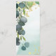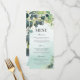 Cartões de cardápio elegantes com uma aquarela rustica esmaecida lavada em fundo, folhas botânicas de eucalipto, pedaços de folha de ouro falsa e um modelo de opção de menu simples.