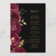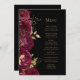 Este elegante cardápio moderno de casamento mostra uma borda de flores burgundy e folhas de folhas falsas de ouro. Personalize o texto em itálico dourado em um plano de fundo preto. A parte traseira do menu é preto estável.