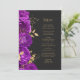 Este elegante cardápio moderno de casamento mostra uma borda de flores roxas e folhas de folhas falsas douradas. Personalize o texto em itálico dourado em um fundo preto de ardósia escura. A parte de trás do menu é a barra sólida preta,