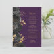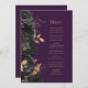 Este elegante cardápio moderno de casamento mostra uma borda de flores pretas e folhas de folhas falsas douradas. Personalize o texto em itálico dourado em um fundo roxo escuro. A parte de trás do menu é roxa sólida.