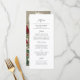 Estes elegantes e bonito menus de casamento são fáceis de personalizar! Eles apresentam texto simples na frente em preto e um design floral no verso em vermelho, branco e verde sobre um fundo de burlap.