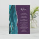 A borda esquerda deste elegante cardápio de casamento moderno apresenta uma borda de ágata em aquarela azul-teal aparada com brilho de prata falso. O texto personalizável combina escrita à mão em cinza prateado e fontes copperplate em um fundo roxo. O verso apresenta um design correspondente de ágata azul-teal e prata.