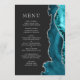 A borda direita deste elegante menu de casamento moderno apresenta uma cor azul-lacrimejante agata borda com falso brilho prateado. O texto personalizável combina fontes de serif romana de cinza prateada e fontes de copperplate em um fundo fora de preto. O verso apresenta um design de barro e de agata prateado correspondentes.