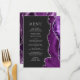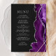 A borda direita deste elegante menu de casamento moderno apresenta uma cor d'água púrpura e borda agitada com falso brilho prateado. O texto personalizável combina fontes de serif romana de cinza prateada e fontes de copperplate em um fundo fora de preto. O verso apresenta um design de agata prateado e roxo correspondente.