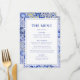 Traga seus convidados de casamento para o coração do México com nosso cardápio de casamento com o tema da Talavera Azul. Esta elegante e moderna design, inspirada pela beleza da cultura Espanhol-Mexicana, adiciona um toque de charme exótico à sua celebração de casamento de destino. Personalize seu cardápio para mostrar os pratos deliciosos que irão deleitar seus entes queridos, e infundir seu casamento com as matizes vibrantes e a riqueza cultural de uma festa espanhola. Com este na moda e cardápio único, sua celebração será uma festa para lembrar, combinando elegância e tradição em um pacote encantador.