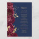 Este elegante cardápio moderno de casamento mostra uma borda de flores burgundy e folhas de folhas falsas de ouro. Personalize o texto em itálico de cor dourada em um fundo azul de marinho. A parte traseira do menu é azul marinho sólido,