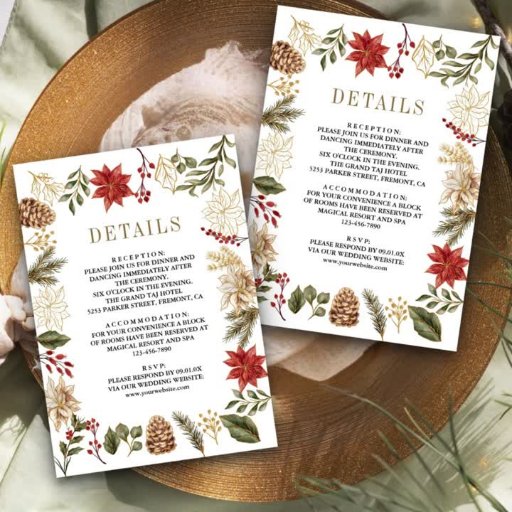 Incêndio aos seus convidados com este cartão de menu elegante com lindas flores vermelhas de poinsettia e folhas de pinheiros rústicas.