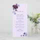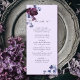 Este cardápio de casamento apresenta um buquê de cor d'água de peões roxos de ameixa e flores azuis de indigo com caligrafia de na moda em fundo de lavanda. Para personalização mais avançada deste design, clique no BOTÃO DESIGN TOOL (FERRAMENTA). Itens correspondentes também estão disponíveis.