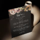 Defina um tom romântico para a sua recepção com este elegante menu de casamento outono com um fundo preto profundo e florais de cor aquosa em branco, pêssego e tons sujos. O moody floral design adiciona um sofisticado toque de boho. Perfeito para casamentos de outono, jantas de ensaio ou comemorações de noivado. O layout inclui espaço para seus detalhes de refeições personalizadas - de início a sobremesa - e parece impressionante exibido na configuração de lugar de cada convidado.