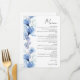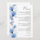 Estes modernos menus de casamento floral transparentes e azuis podem ser personalizados com sua informação na tipografia moderna. Projetado por Thisnotme©