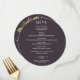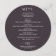 Um cartão de menu redondo jantado sobre um fundo castanho roxo dramático e detalhes do menu em letras brancas quicas com lindas flores aquarelas em rosa e ouro no verso. Perfeito para uma recepção de casamento moderna, janto de ensaio de casamento, festa de aniversário ou qualquer evento especial com um janto sentado. CORRESPONDENDO a itens na nossa loja.