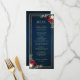 Menu de casamento floral azul-escuro, arrojado, geométrico, com buquê elegante de azul-marinho, azul-real, branco, esbranquiçado, lenhoso, rosa de marsala e folhas verdes de eucalipto sage e elegante quadro neutro geométrico de brilho dourado. Entre em contato comigo para obter ajuda sobre a personalização ou se você precisar de outro produto com este design.
