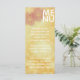 Menu de Comida de Casamento "Golds Asiáticos Influenciados de Amarelos" Amarelos pintados de forma grosseira, ouro e magenta sobrepostos com aves pintadas e flores de cor macia. Personalize este menu de comida de casamento. Simplesmente exclua o texto em ambos os lados do cartão de menu e substitua por suas próprias palavras. Escolha seu estilo, cor e tamanho de fonte favoritos. Os elementos da flor podem ser movidos, eliminados e/ou ajustados! Obrigados para parar e comprar! Muito apreciado! Feliz Dia de Casamento! Estilo: 4" x 9" Impresso em estoque de cartão branco de 100 lb com acabamento de brilho Impressão de alta qualidade, cor de cheio e sangramento de cheio