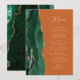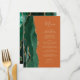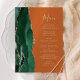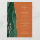 A borda esquerda deste elegante cardápio moderno de casamento apresenta uma esmeralda verde aquarela agata borda com falsa brilho dourado. O texto personalizável combina um script de escrita manual branco de cor dourada e fontes de impressão em um fundo laranja queimado. O verso apresenta um design emerald verde e dourado.