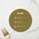Este design de cardápio de casamento contemporâneo mostra os cursos da sua refeição de casamento em simples fontes e um design elegante e limpo. Este cardápio do círculo verde-oliva destaca-se certamente da multidão. Tipografia moderna para um casamento moderno. Todos os elementos são personalizáveis - texto, fundo e cores. Edite os nomes e datas no verso - ou simplesmente exclua se quiser usar este cartão de menu redondo para um evento que não seja um casamento.