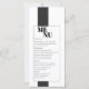 Elevem sua experiência de jantar de casamento com nossa design de Menu de Casamento Mínimo Preto e Branco. Este menu chic e eterno apresenta uma elegante paleta de cores preto e branco, perfeita para temas modernos e elegantes de casamento. O layout minimalista garante que seus convidados possam ler facilmente o menu enquanto adiciona um toque sofisticado às configurações de mesa. Ideal para eventos em tempo negro, temas monocromáticos ou celebrações contemporâneas, esse design combina estilo e função sem esforço. Personalize-o com os detalhes do menu para tornar o seu grande dia inesquecível.
