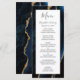 Este menu de casamento elegante e moderno apresenta um fundo de ágata azul naval em aquarela aparado com brilho falso dourado. O texto aparece em escrita à mão cinza carvão elegante e fontes copperplate em um retângulo branco. O design de ágata é repetido no verso.