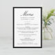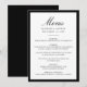 Este cardápio de casamento moderno apresenta “Menu” em elegante caligrafia preta, combinado com letras serifadas refinadas para os nomes do casal, data do casamento e pratos da recepção. Uma moldura preta em negrito emoldura o layout, criando um visual limpo e estruturado que parece atemporal e sofisticado. A tipografia clássica e o forte contraste oferecem uma apresentação sofisticada para suas opções de refeição, tornando este cardápio uma bela adição para ambientes formais, modernos e tradicionais de mesas de casamento.