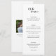 Cardápio de casamento moderno com design simples e "NOSSO cardápio" em uma combinação de uma fonte elegante e moderna sem serifa. A parte traseira tem sua foto, nomes e data do casamento.
