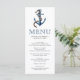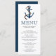 Elegante menu de casamento do tema náutico com uma âncora e corda pintados com uma tipografia moderna.