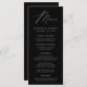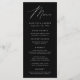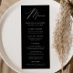 Menu de casamento simples e elegante com "Menu" exibido em um roteiro branco moderno com um fundo preto com speck brancos sutis. Personalize o menu de casamento preto adicionando seus nomes, data de casamento e informações do menu. Projetado para coordenar com a nossa coleção de casamento do Modern Elegance.