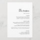 Nosso moderno Menu de Casamento Negro e Branco minimalista incorpora a sofisticação do eterno. Com um design limpo, complementa seu tema moderno. O layout minimalista garante clareza, exibindo os itens de menu de forma dinâmica e organizada. Elevem a vossa experiência de jantar e impressionem os vossos convidados com este menu saboroso que espelha a elegância contemporânea do vosso dia especial.