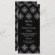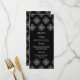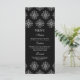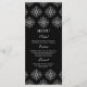 Este menu de comida de casamento na moda tem um fundo preto elegante com um design damask branco flocos de neve no topo e no fundo. No meio, você pode personalizar facilmente isso com o menu.