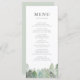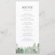 Este cartão de menu personalizável apresenta uma floresta verde-nevada em cores aquáticas moles, fazer-a como um ajustado excelente para casamentos no inverno, chás de panela ou eventos temáticos rústicos. A design inclui árvores cada vez verdes com neve caindo em tons verdes e brancos calmantes. Ele adiciona uma floresta, um toque sazonal ao seu cenário de mesa. Personalize-o com o nome do evento, os detalhes do menu e qualquer outro texto necessário. Este cartão de menu de aquarela é uma maneira simples e elegante de juntar seu tema.