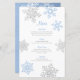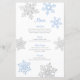 Barato azul de lapis, cinza prateada (cinza) floco de neve de inverno menus personalizados de casamento. O design apresenta um floco de neve azul e cinza prateado, ousado e moderno, lapis. NOTA: este é um design impresso plano sem nenhum embelezamento em relevo ou em 3D. Este é um cardápio de casamento barato excelente para um casamento no inverno com um tema de floco de neve azul e prateado.
