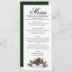 Este belo menu irá adicionar algum estilo à sua recepção de casamento. Ele apresenta um belo e rústico design com um aglomerado de pinecones e pinos, abeto ou ramificações amarradas com um arco branco de cebola. Há espaço para os nomes do casal e da data do casamento, e o texto é totalmente personalizável. A parte de trás é uma cor verde da floresta marmoreada. Perfeito para um casamento ao ar livre, de inverno ou de férias.