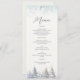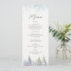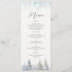 Defina um tom encantador para sua recepção com este menu de casamento no inverno elegante. Apresentando uma serena pinheira na base e delicados detalhes de neve no topo, essa design combina encanto rústico com sofisticação sazonal. Um complemento perfeito para acolchoada floresta, abrigo ou casamentos de dezembro.