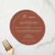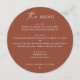 Adicione uma vibração morna à sua celebração com este elegante cartão de menu redondo de terracota, projetado para o moderno casal boho. Com um layout minimalista limpo e tom de queda rico, este menu circular de cor de argila combina o encanto rústico com o estilo contemporâneo. Perfeito para casamentos de outono, cerimônias de pôr do sol, ou eventos inspirados no deserto. Totalmente personalizável, também é ideal para ensaiar jantas, chás de panela, aniversários ou qualquer reunião especial que exija um pouco de elegância sem esforço.