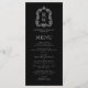 Este elegante design de cardápio de casamento inspirado em vintage apresenta um par de iniciais de monograma branco em letra serif aberta acima e abaixo de uma linha divisória e rodeado por uma crista botânica de arte de linha sobre um fundo preto. A parte traseira da placa é preta e sólida.